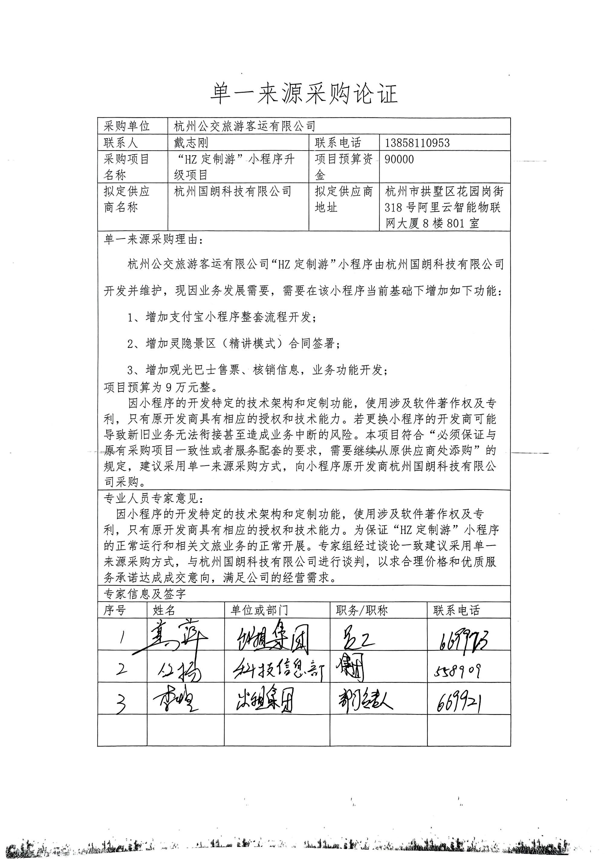 杭州公交旅游客运有限公司“HZ定制游”小程序升级项目单一来源采购公示
